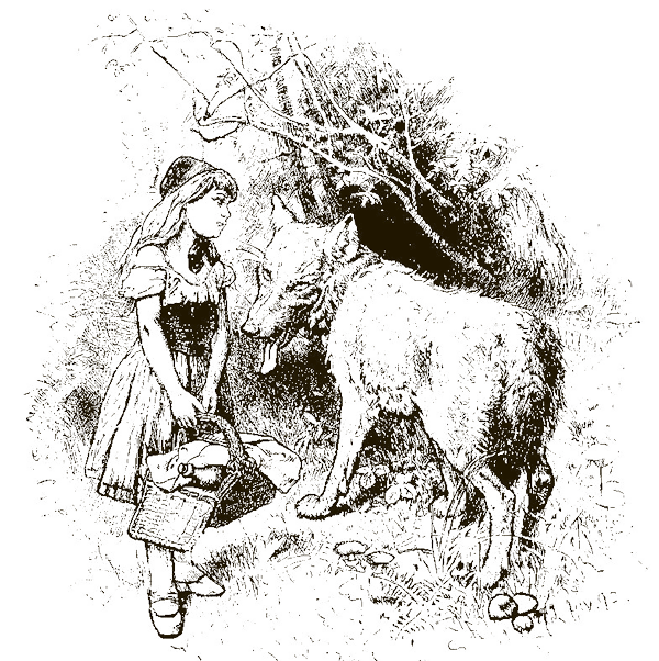 Бабушка девочки жила на опушке леса, в получасе ходьбы от деревни. И чуть только Красная Шапочка вступила под своды деревьев, повстречался ей Волк. Но девочка не знала, что это лютый зверь, и ничуть его не испугалась.