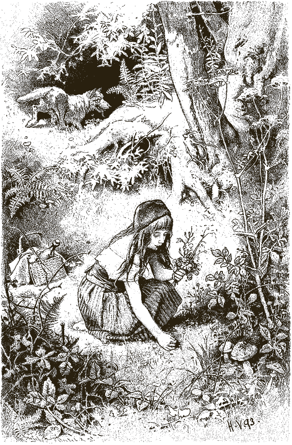 Красная Шапочка посмотрела вокруг и увидела, что на полянках растёт множество прелестных цветов. «А не принести ли мне бабушке букет цветов?» – подумала Красная Шапочка. Сбежала она с тропинки и стала собирать цветы. Сорвёт один цветочек, тут её уже другой манит, лучше первого… И уходила она от тропинки всё дальше и дальше в глубь леса.