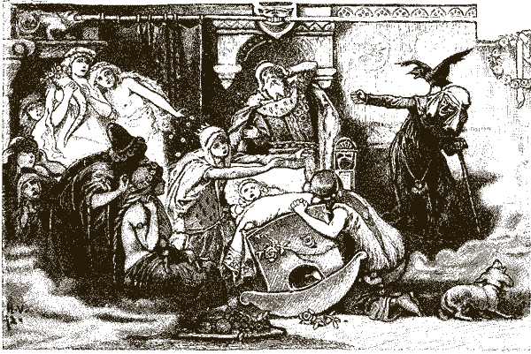 Одиннадцать волшебниц уже поднесли свои подарки, как вдруг в пиршественный зал вошла ещё одна волшебница. Она была оскорблена тем, что её не пригласили на праздник, и решила отомстить королю и королеве. Не здороваясь и ни на кого не глядя, подошла она к колыбельке и воскликнула: