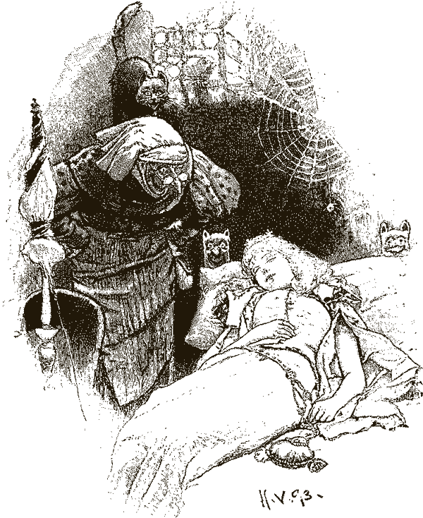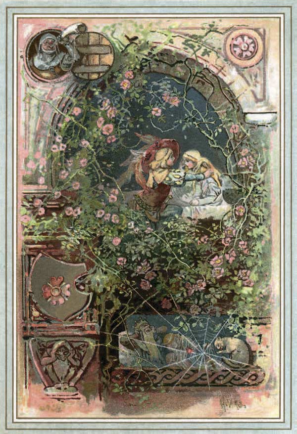Шёл королевич мимо спящих придворных, короля и королевы и наконец приблизился к старой башне. Поднявшись по винтовой лесенке, очутился он в затянутой паутиной комнатке. На кровати лежала девушка, и была она столь прекрасна, что не удержался королевич, наклонился и поцеловал её.