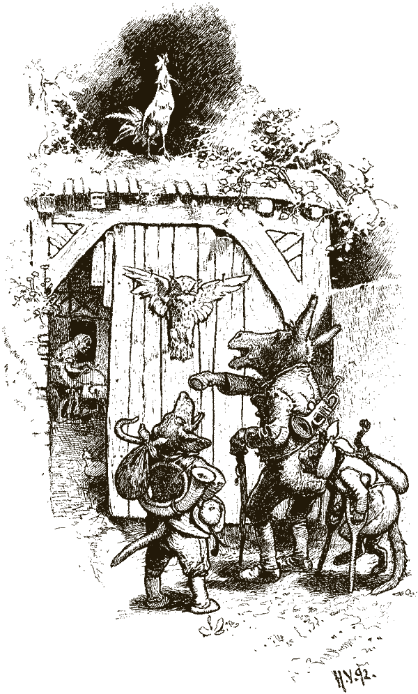 Тут уселись приятели за стол и так наелись, будто голодать им предстояло недели три. Покончив с ужином, четверо музыкантов погасили огонь и стали искать постели, каждый по своему вкусу и удобству. Осёл улёгся на куче навоза во дворе, собака прикорнула у двери, кот растянулся у очага, а петух взлетел на шесток. И так как все они были утомлены долгим странствием, то быстро заснули.