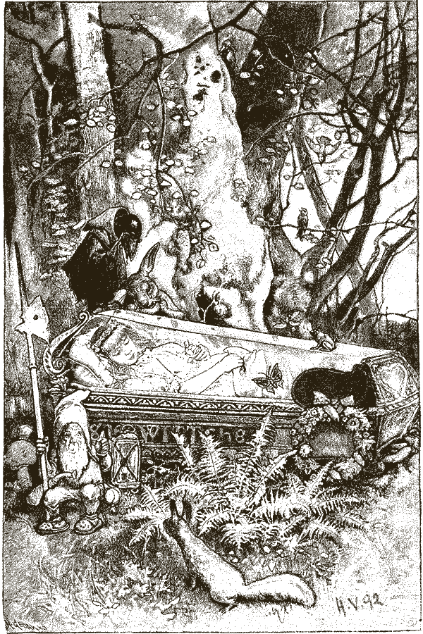 – Ты, королева, здесь всех милей…А гномы, найдя Снегурочку бездыханной, стали искать причину обморока: расшнуровали ей платье, расчесали волосы, обмыли водой… Однако ничто не помогало, мёртвой лежала Снегурочка. Правда, гномы заметили, что выглядит девушка словно живая, даже щёки её горят прежним румянцем. Смастерили тогда гномы прозрачный хрустальный гроб, написали на нём золотыми буквами имя красавицы, положили в гроб Снегурочку и унесли его на вершину горы. По очереди несли гномы у гроба стражу.