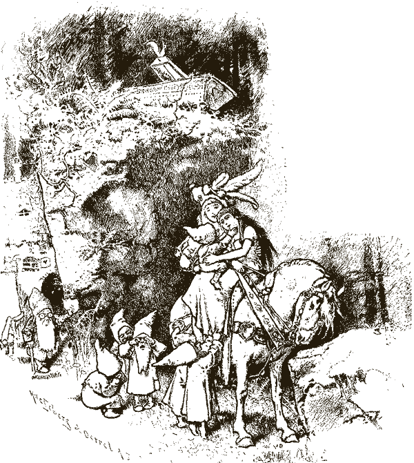 И случилось заехать на вершину горы королевичу. Увидел он красавицу Снегурочку и сразу же влюбился. Стал умолять он гномов отдать ему девушку: