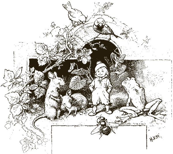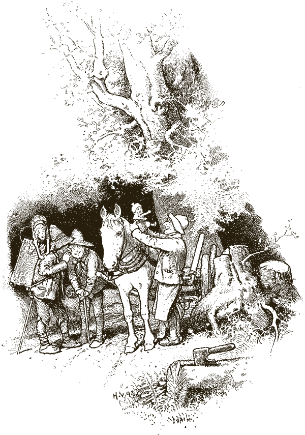 Стали путешественники бегать по полю и тыкать палкой в мышиную нору, но всё было напрасно: Мальчик-с-пальчик всё глубже и глубже забирался. Когда совсем стемнело, отправились путники своей дорогой с пустым кошельком.