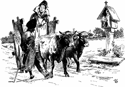 Вышел он на большую дорогу и стал выжидать, что будет. Вот и видит: едет к нему по дороге телега и на телеге едет баба стоя, хотя ей было бы удобнее присесть на охапку соломы, положенную в телеге, или идти рядом с волами, впряженными в нее.