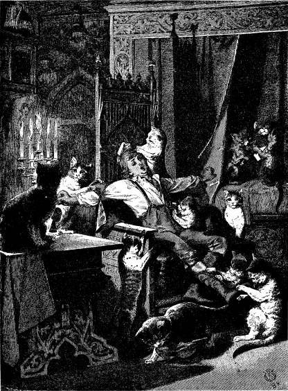 Вечером, когда кошечка с Гансом за стол садились, три кошки должны были утешать их музыкою: одна играла на контрабасе, другая на скрипке, третья в трубу трубила, преусердно раздувая щеки.