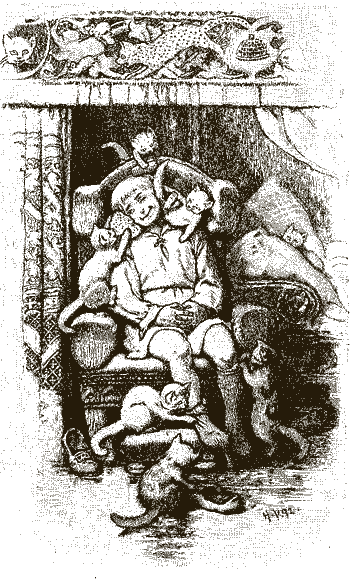 Бросились кошечки выполнять приказание. Одна свечой светит, вторая обувь снимает, третья чулки стягивает, четвёртая свечу задувает, когда Ганс в кровать лёг… С тех пор так и повелось. А утром кошечки помогали Гансу собраться: надевали чулки, приносили обувь, умывали, а потом утирали его лицо хвостиками.