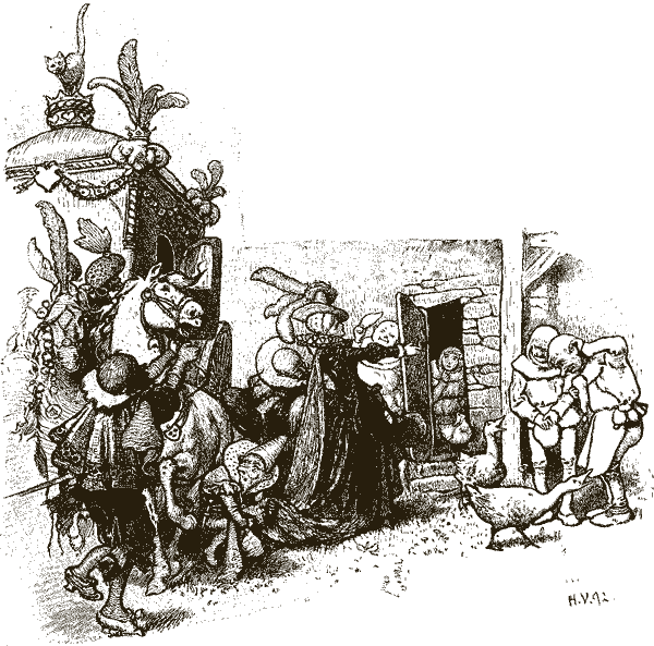 Через три дня подъехала к мельнице карета, запряжённая шестёркой прекрасных коней. А рядом с каретой слуга вёл лошадь, выбранную Гансом. Вышла навстречу мельнику красавица королевна и спросила, где же батрак Ганс.