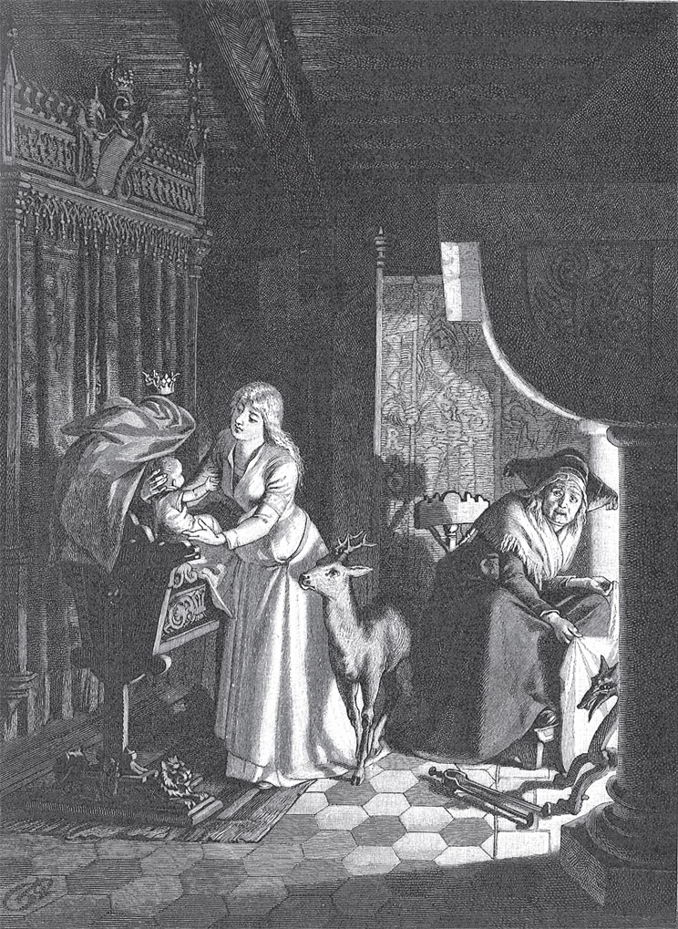 Вот старая ведьма и приняла на себя внешность королевиной служанки, вошла в комнату, где лежала родильница, и сказала: «Пожалуйте, ванна для вас готова, она вам будет полезна и придаст вам новых сил; пожалуйте скорее, пока не остыла вода».