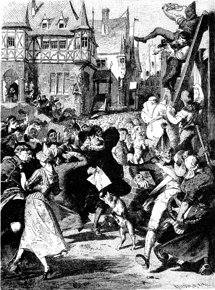 Вскоре и все кругом заплясало, все, что сбежалось на базарную площадь из любопытства, – старые и малые, толстяки и худощавые; даже собаки, и те стали на задние лапы и стали прыгать вместе со всеми. И чем долее играл он, тем выше прыгали плясуны, так что даже головами стали друг с другом стукаться, и напоследок все подняли жалобный вой.
