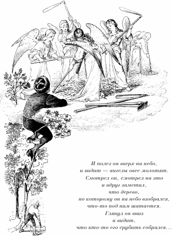 И полез он вверх на небо, и видит – ангелы овес молотят. Смотрел он, смотрел на это и вдруг заметил, что дерево, по которому он на небо взобрался, что-то под ним шатается. Глянул он вниз и видит, что кто-то его срубить собрался…