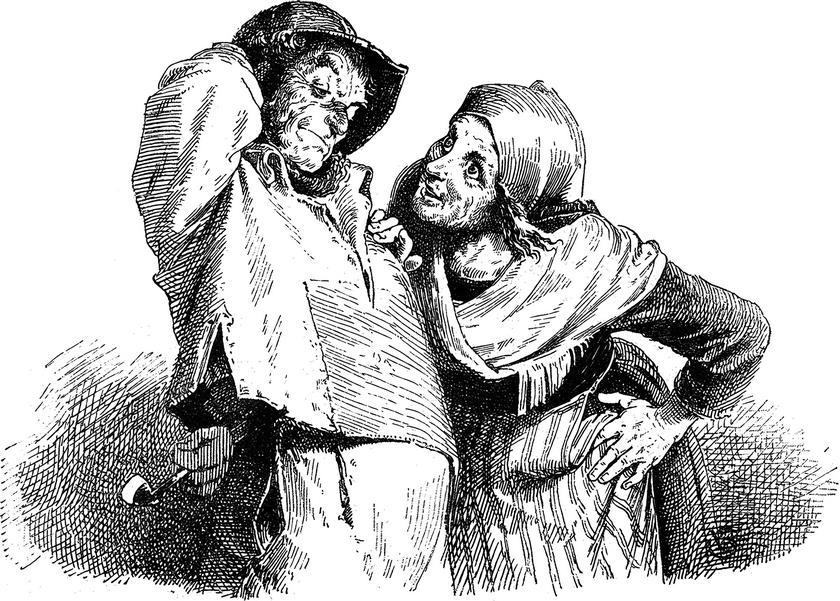 Поднялась баба на три лестницы со своим тяжелым коробом к портняжке в каморку и должна была перед ним все горшки с вареньем выставить. Он их все осмотрел и все понюхал, и сказал наконец: «Кажись, хороша штука! А ну-ка, тетка, отвесь мне этого добра лота с четыре, а то, пожалуй, и всю четверть фунта».