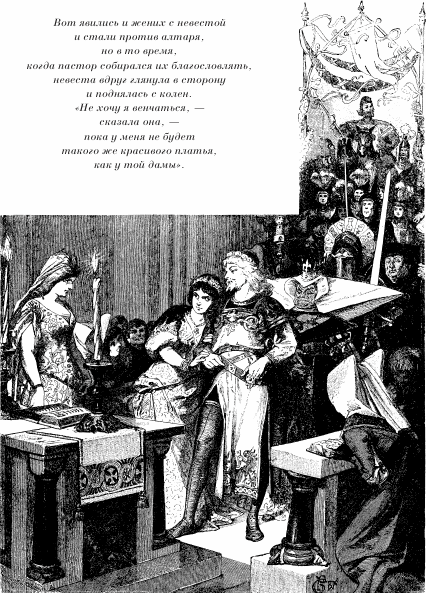 Вот явились и жених с невестой и стали против алтаря, но в то время, когда пастор собирался их благословлять, невеста вдруг глянула в сторону и поднялась с колен. «Не хочу я венчаться, – сказала она, – пока у меня не будет такого же красивого платья, как у той дамы».