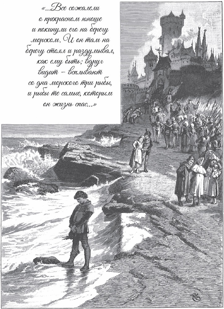 Все сожалели о прекрасном юноше и покинули его на берегу морском. И он там на берегу стоял и раздумывал, как ему быть; вдруг видит – всплывают со дна морского три рыбы, и рыбы те самые, которым он жизнь спас. Средняя из них держала во рту раковину, которую она и положила на берегу у ног юноши; а когда тот раковину поднял и вскрыл, то в ней оказалось золотое кольцо.