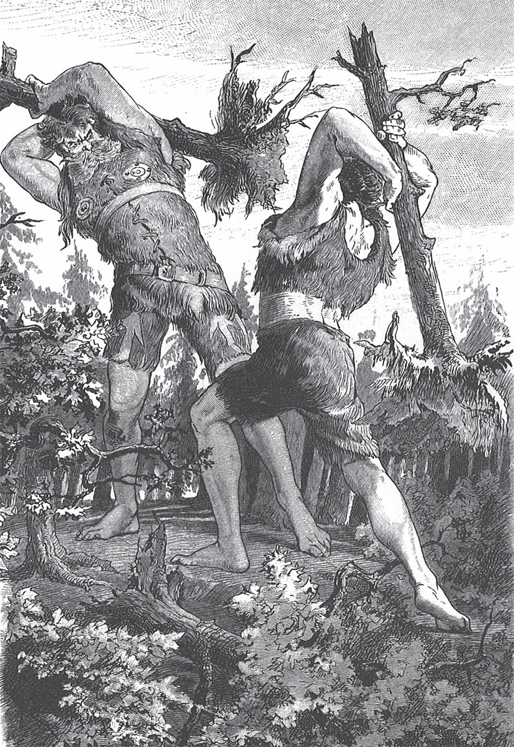 «…Тот не остался в долгу, и они оба пришли в такое исступление, что стали вырывать деревья с корнями и теми деревьями побивать друг друга, пока наконец оба пали мертвые на землю…»