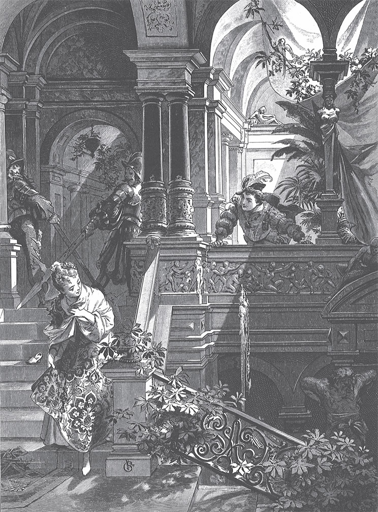 «…Однако же Принц заранее пустился на хитрость: велел вымазать всю лестницу смолою. Как сбегала Замарашка с лестницы, одна ее туфелька и пристала к ступеньке. Королевич туфельку поднял, и туфелька та была маленькая, хорошенькая и вся золотая…»