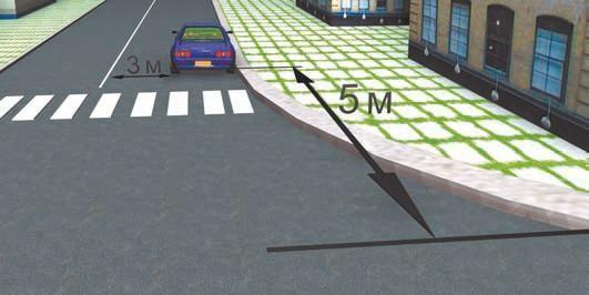 Водитель поставил автомобиль за пешеходным переходом в 5 м от края пересекаемой п роезжей части, а расстояние от автомобиля до сплошной осевой линии разметки составляет 3 м. Это соответствует ПДД (пп. 12.4 и 12.5). Правильный ответ – 1.