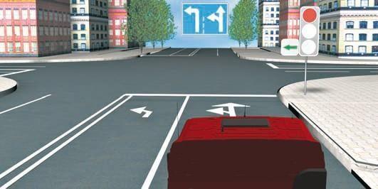 В данном случае поворот налево разрешен зеленой стрелкой дополнительной секции светофора, дорожной разметкой и дорожными знаками. Движение прямо запрещено красным сигналом светофора, а разворачиваться можно только из крайней левой полосы (п. 8.5 ПДД), поэтому разворот в данном случае также запрещен. Значит, двигаться можно только налево. Правильный ответ – 1.