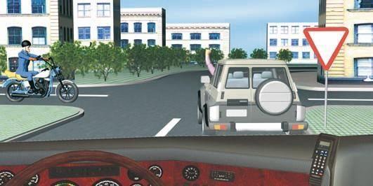 В соответствии с п. 8.1 ПДД, поднятая вверх правая или левая рука является сигналом торможения. В данном случае очевидно, что водитель притормозил перед знаком 2.4 «Уступите дорогу» для того, чтобы пропустить движущегося по пересекаемой проезжей части мотоциклиста. Поэтому он поднятой рукой подал соответствующий знак едущему следом водителю. Правильный ответ—3.