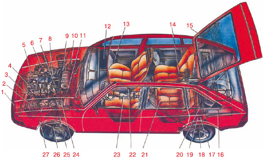 Общий вид легкового автомобиля: 1 – фара; 2 – вентилятор системы охлаждения двигателя; 3 – радиатор системы охлаждения двигателя; 4 – распределитель зажигания; 5 – двигатель; 6 – аккумуляторная батарея; 7 – катушка зажигания; 8 – воздушный фильтр; 9 – телескопическая амортизаторная стойка передней подвески; 10 – бачок омывателя ветрового стекла; 11 – коробка передач; 12 – ручка стеклоподъемника; 13 – внутренняя ручка двери; 14 – рычаг задней подвески; 15 – элемент обогрева заднего стекла; 16 – основной глушитель; 17 – задний амортизатор; 18 – задний тормоз; 19 – балка задней подвески; 20 – поперечная штанга задней подвески; 21 – топливный бак; 22 – рычаг стояночной тормозной системы; 23 – дополнительный глушитель; 24 – вакуумный усилитель тормозной системы; 25 – вал привода передних колес; 26 – передний тормоз; 27 – штанга стабилизатора передней подвески