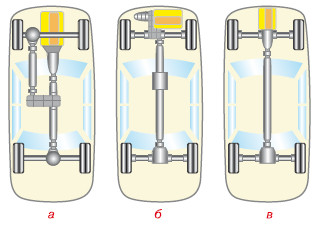 Рис. 1.12. Полноприводной автомобиль: а – с раздаточной коробкой; б – с полным приводом, подключаемым автоматически; в – с постоянным полным приводом