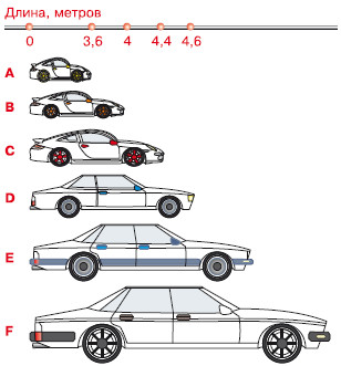 Классификация по габаритным размерамВ современной автомобильной промышленности различают шесть европейских классов в зависимости от габаритных размеров автомобиля. Классы обозначаются буквами латинского алфавита: A, B, C, D, E, S (или F) (рис. 1.13).