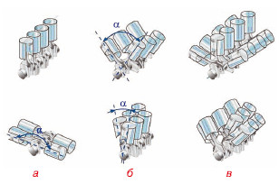 а – четырехцилиндровые; б – шестицилиндровые; в – двенадцатицилиндровые (α – угол развала)