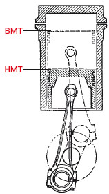 Верхней мертвой точкой (ВМТ) называется самое верхнее положение поршня в цилиндре (то есть место, где поршень перестает двигаться вверх и готов начать движение вниз) (см. рис. 2.3). Самое нижнее положение поршня в цилиндре (то есть место, где поршень перестает двигаться вниз и готов начать движение вверх) называют нижней мертвой точкой (НМТ) (см. рис. 2.3). А расстояние между крайними положениями поршня (от ВМТ до НМТ) называется ходом поршня.