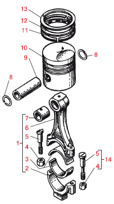 1 – шатун в сборе; 2 – крышка шатуна; 3 – вкладыш шатуна; 4 – гайка болта; 5 – болт крышки шатуна; 6 – шатун; 7 – втулка шатуна; 8 – стопорные кольца; 9 – палец поршня; 10 – поршень; 11 – маслосъемное кольцо; 12, 13 – компрессионные кольца