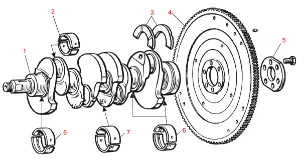 1 – коленчатый вал; 2 – вкладыш шатунного подшипника; 3 – упорные полукольца; 4 – маховик; 5 – шайба болтов крепления маховика; 6 – вкладыши первого, второго, четвертого и пятого коренных подшипников; 7 – вкладыш центрального (третьего) подшипника