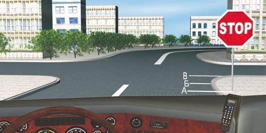 Вы должны остановиться перед краем пересекаемой проезжей части. Если бы на дороге была линия разметки 1.12 «Стоп-линия», то остановиться следовало бы перед ней. Правильный ответ—3.