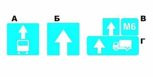 В начале дороги с односторонним движением из перечисленных выше знаков устанавливается только знак 5.5 «Дорога с односторонним движением» (Б). Знаком 5.14 «Полоса для маршрутных транспортных средств» (А) обозначается полоса, предназначенная для движения маршрутных транспортных средств. Знаком 6.14.2 «Номер маршрута» (В) обозначаются номер и направление маршрута на перекрестке. Знак 6.15.3 «Направление движения для грузовых автомобилей» (Г) показывает рекомендуемое направление движения для грузовиков. Правильный ответ – 2.