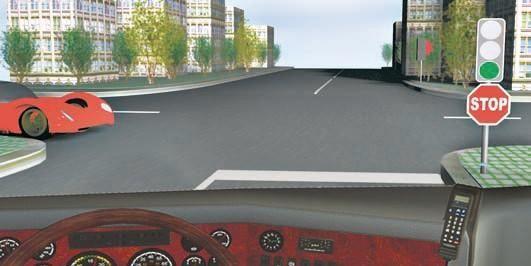 В данном случае вы можете проехать перекресток без остановки, поскольку при работающем светофоре (в вашем направлении горит зеленый свет) знак 2.5 «Движение без остановки запрещено» не действует. Правильный ответ – 2.