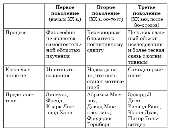 «Почему люди делают то, что они делают?» Философы и мыслители бьются над этим вопросом уже более 2000 лет. Древнегреческие философы Сократ и Платон говорили, что человеческое поведение направлено на удовольствие. В начале ХХ века Фрейд считал, что людьми движет подсознание, инстинкты жизни и инстинкты смерти. В 1960-х годах Абрахам Маслоу нарисовал знаменитую пирамиду потребностей, заявив, что мотивация людей заключается в удовлетворении потребностей и исполнении их ожиданий. В 1980-х годах Эдвард Деси и Ричард Райан предложили теорию самодетерминации, полагая, что мотивация в основном связана с познанием себя и окружающего мира, что в настоящее время является наиболее распространенной теорией в психологии (см. таблицу ниже).