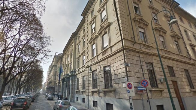 Fotografía, con objetivo de gran angular, del edificio de la Comisaría de Turín, sacada desde la esquina entre corso Vinzaglio y via Grattoni, tomada del Quotidiano Piemontese del 19 de agosto de 2014 en la página de Internet https://www.quotidianopiemontese.it/2014/08/19/provincia-torino-lacqua-gola-vende-palazzo-questura/