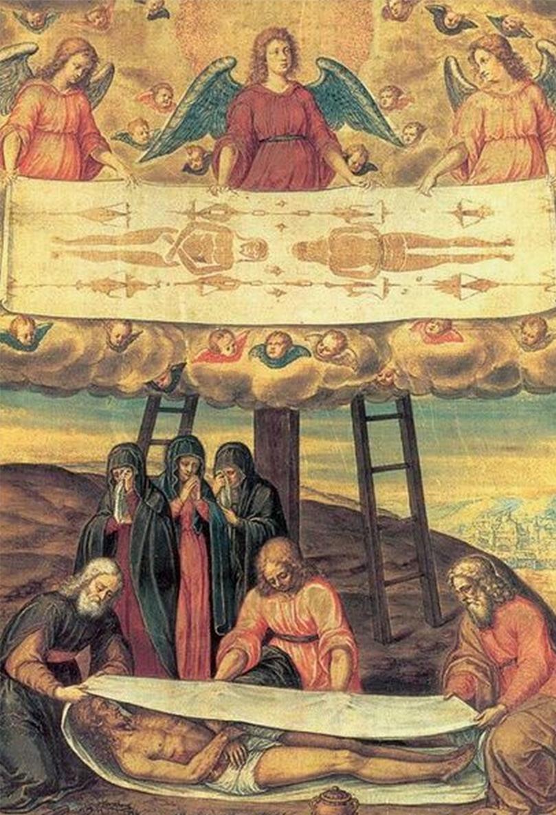 One of the two paintings by Giovanni Battista della Rovere “il Fiammenghino”, depicting Jesus wrapped in the Shroud (the other one is printed on cover page)
