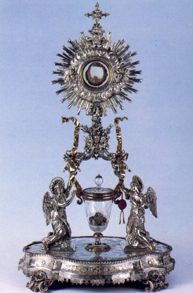 the Ostensory at the Sanctuary of Lanciano with the flesh and a crystal cup containing the clotted blood :
