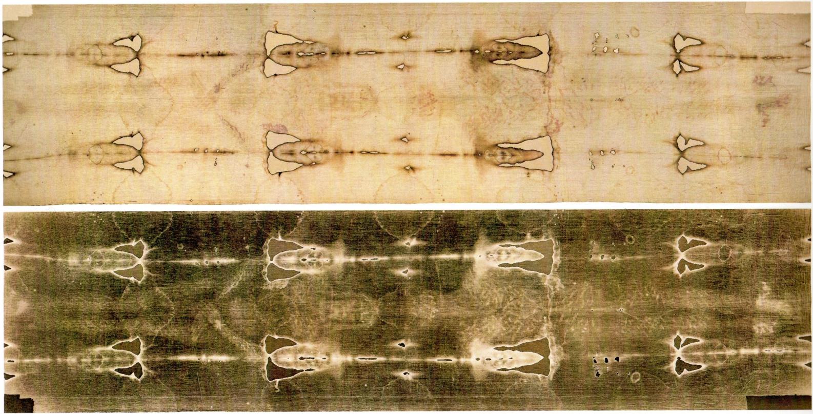 The back and front image of a human body is clearly imprinted on the linen cloth. Essentially, this figure appears as a photographic negative; but, once exposed on a photographic film, or earlier on a photographic plate, it emerged as a photographic positive. It is as the Man on the Shroud had looked himself in the mirror and his reflected image had been imprinted on it as a photographic negative: like in each negative and like in a mirrored image, the right side appears as the left one, and vice versa.