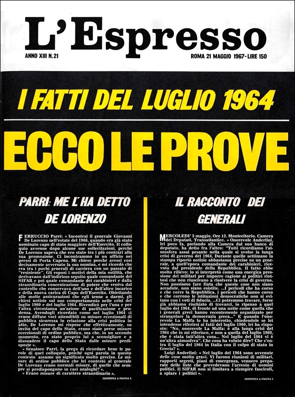 Solo nel 1967 la notizia sarebbe sfuggita e, raccolta dal settimanale L’Espresso, sarebbe stata da questo divulgata il 14 e il 21 maggio di quello stesso anno con un’inchiesta giornalistica, divenendo di pubblico dominio. Si sarebbe saputo, fra l’altro, che solo nel dicembre 1965 e non prima, al termine cioè d’un duraturo periodo d’indecisione dei vertici politici, il Comandante Generale dei Carabinieri ed ex comandante dei servizi segreti era stato rimosso dal suo incarico; e sarebbe corsa voce, verosimilmente per informazioni dell’onnipresente agenzia di spionaggio statunitense CIA, che se quel generale di corpo d’armata era apparso l’ideatore del piano eversivo, questo poteva esser stato voluto da certi importanti uomini politici della destra democristiana29 .