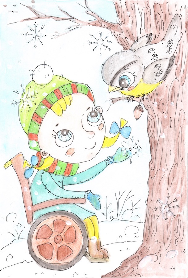 А сегодня Светланка выехала на своём креслице в зимний сад. Нужно покормить птиц. Девочка оделась тепло: шубка, валеночки, шапочка с пушистым помпоном, варежки. На улице холодно. Светланка нажала на кнопочку своего креслица. И оно повезло хозяйку по заснеженной дорожке, которая была проложена среди высоких сугробов. Снег весело скрипел под колёсами креслица.