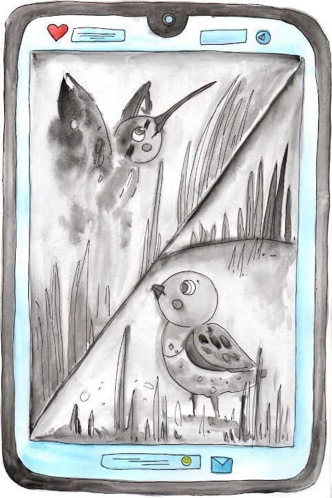 Коростель наклонился пониже и побежал впереди Светланки. Бекас Виталий летел над её головой. Вот уже и яблонька с фотоловушкой на стволе. Коростель Денис остановился. Бекас Виталий приземлился рядом.