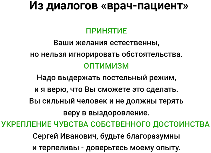 Не навязывайте решения, не создавайте ощущения зависимости у пациента, давления или принуждения.