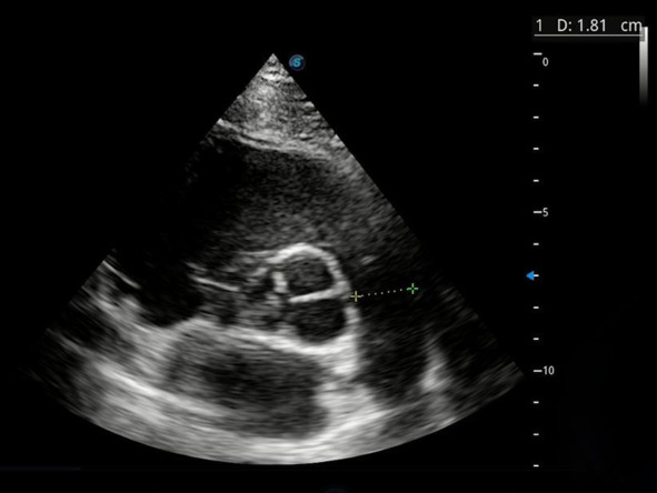 Снова возвращаемся в парастернальную позицию по короткой оси на уровне аорты. Наша задача – измерить диаметр легочного ствола, на рисунке 10 он составляет 1,81 см.