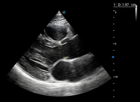 Далее мы должны определить конечно-систолический размер. Обратите внимание, само название дает нам подсказку: конечно-диастолический размер мы определяем в конце диастолы, а конечно-систолический размер в конце систолы. Необходимо перемотать кинопетлю на конец систолы, когда створки митрального клапана закрыты, так мы сможем измерить наименьший размер левого желудочка. Проводим измерение: получаем 2,7 см (рис.5).