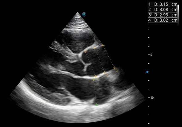 С каждого изображения мы должны получить максимум информации. Проводим перпендикуляр, измеряем синусы Вальсальвы, затем синотубулярное соединение и восходящую часть аорты – ее максимальную часть. Все измерения видны на рисунке 3: синусы Вальсальвы – 3,1 см, восходящая часть аорты – 2,93 см, а синотубулярное соединение – 3,0 см. Здесь же можно измерить линейный размер левого предсердия, для этого мы проводим перпендикуляр и делаем замеры, в данном случае получили ровно 3 см (рис. 3).