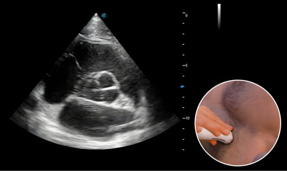 Переходим к следующему доступу. Из парастернальной позиции по короткой оси на уровне аортального клапана (рис. 12) это можно сделать легким движением, смещая датчик аппарата вниз (рис. 13).