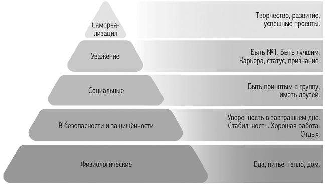 Пирамида потребностей указывает на то, что человек не может развиваться, пока не удовлетворены его базовые потребности (физиологические, социальные, а также потребности в безопасности, любви и принадлежности).