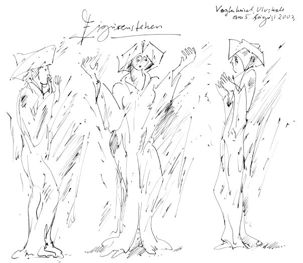 Наконец мы остановились перед самой знаменитой парой. Экскурсовод многозначительно улыбнулась, словно проявив снисходительность к нашему нетерпению. Эккехард и Ута. Она стоит, как стояла всегда: по левую руку от него, прикрыв лицо справа воротом плаща. А поскольку взгляд её прежде всего неприветливый, то и приподнятый воротник плаща можно трактовать как соответствующее отношение к супругу. Верно, вот уже и слышу шепоток в нашей группе: «Смотри, она, похоже, довольно сильно сердится на своего старикана…»