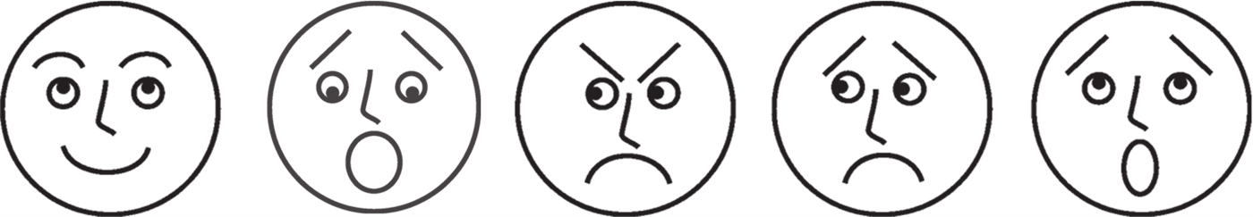 Для развития восприятия и понимания взаимосвязи эмоций и основного тона высказывания в играх применяются специальные обозначения – пиктограммы, символизирующие наиболее яркие по проявлениям эмоциональные состояния: радость, страх, гнев, печаль, удивление.