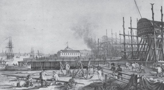 Вспомним пушкинское уподобление России спущенному на воду кораблю. Кораблестроение, сопровождающееся «стуком топора», стало одним из главных дел нового города, определяющих его рост, развитие, самую его жизнь. Оно началось здесь с первых недель и месяцев его истории.